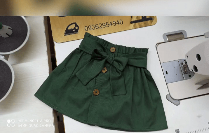 سپس این دو تکه را با چرخ خیاطی می دوزیم تا محکم شود و سپس بندینک ها را مانند پاپیون روی هم گره می زنیم. بعد از باز کردن سوزن ها از قسمت وسط دامن، می توانیم دکمه هایی هماهنگ با رنگ دامن و به سلیقه خود روی آن بدوزیم. این دامن به سه دکمه احتیاج دارد.
